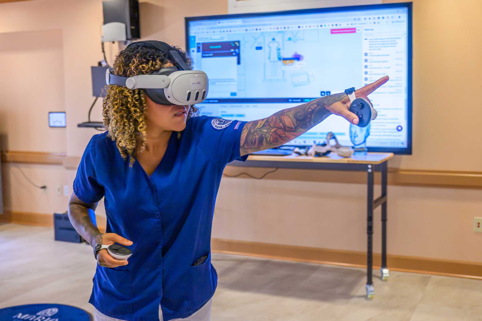 The goal isn’t to practice those motor skills. But being a nurse isn’t just about being able to find a vein or take vitals. They are part of the medical team — and educators say virtual reality helps them learn that role.